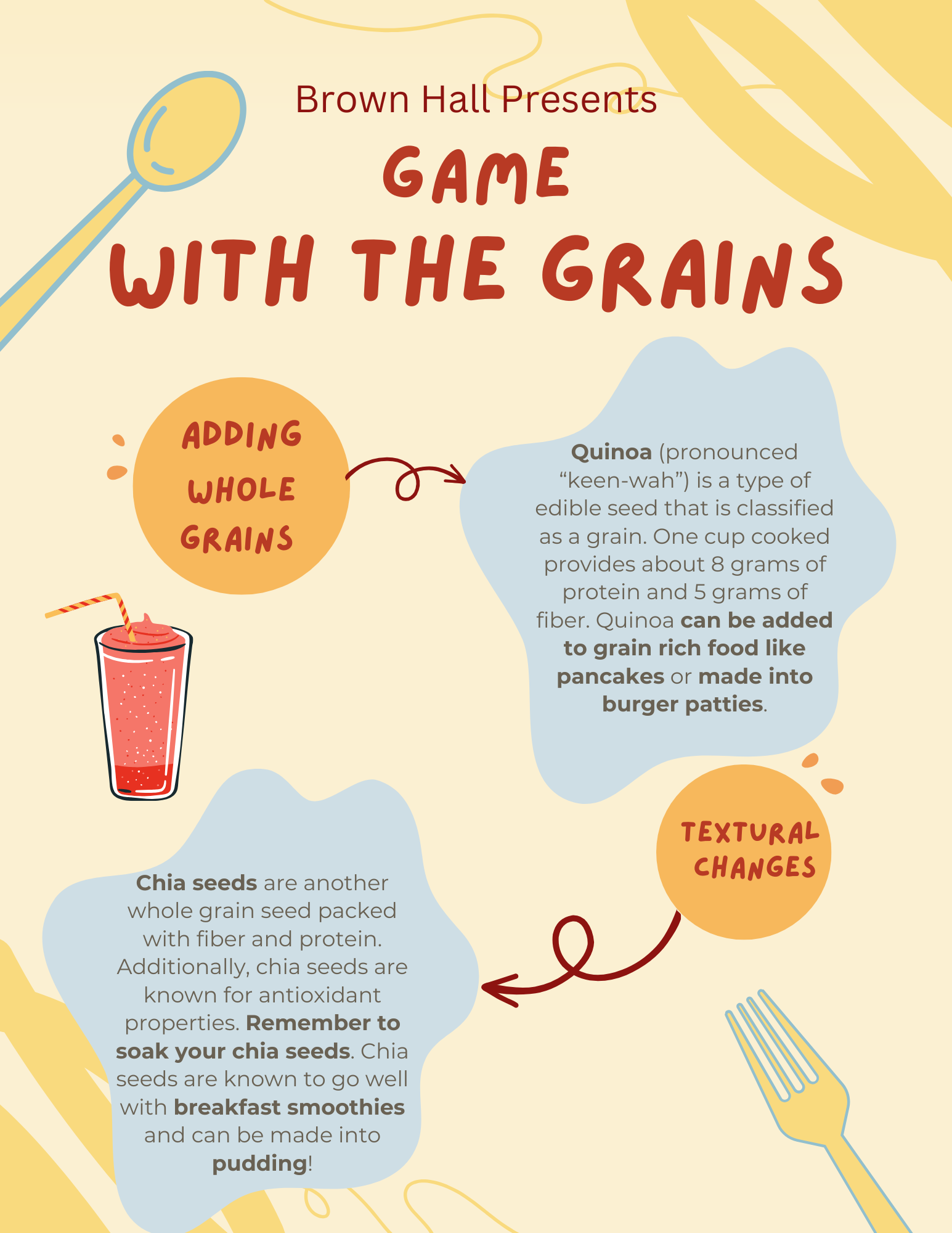 For our event, "Most Important Meal" (2025), I crafted sheets to highlight ways Brown Hall residents could incorporate nutritional breakfast options into their daily routine.